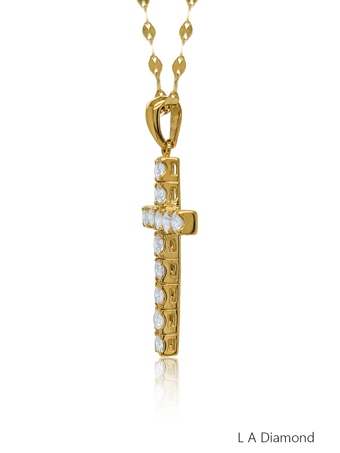 Express your devotion with the magnificent La Diamond Diamond Cross Pendant. This substantial piece is meticulously crafted in radiant 14K Yellow Gold and features a continuous display of brilliant Round Brilliant-cut diamonds set across the entire surface of the cross. The elegant design is defined by a striking total diamond weight of 2.35 carats, offering extraordinary fire and brilliance.
