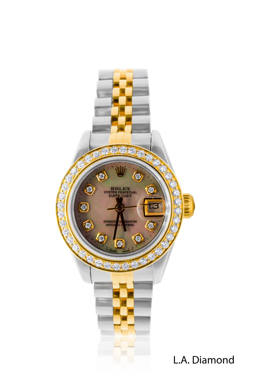 18K Yellow Gold Pre-Owned Rolex Oyster Perpetual Date Just with diamond dial & Diamond Bezel.