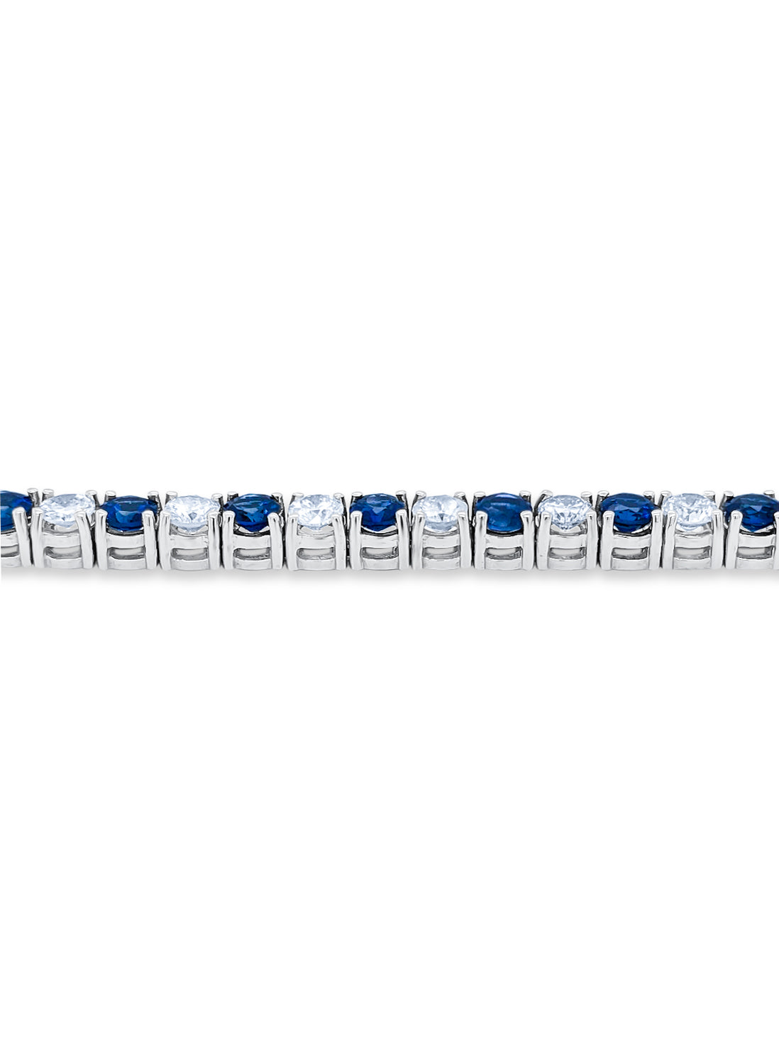 Embody regal sophistication with this magnificent 14K White Gold diamond and sapphire bracelet. Featuring a captivating design, this piece masterfully pairs the fiery brilliance of diamonds with the deep, mesmerizing blue of natural sapphires. The luxurious sparkle is defined by an impressive total gem weight, including 7.85 total carat weight of diamonds and 6.75 total carat weight of sapphires.