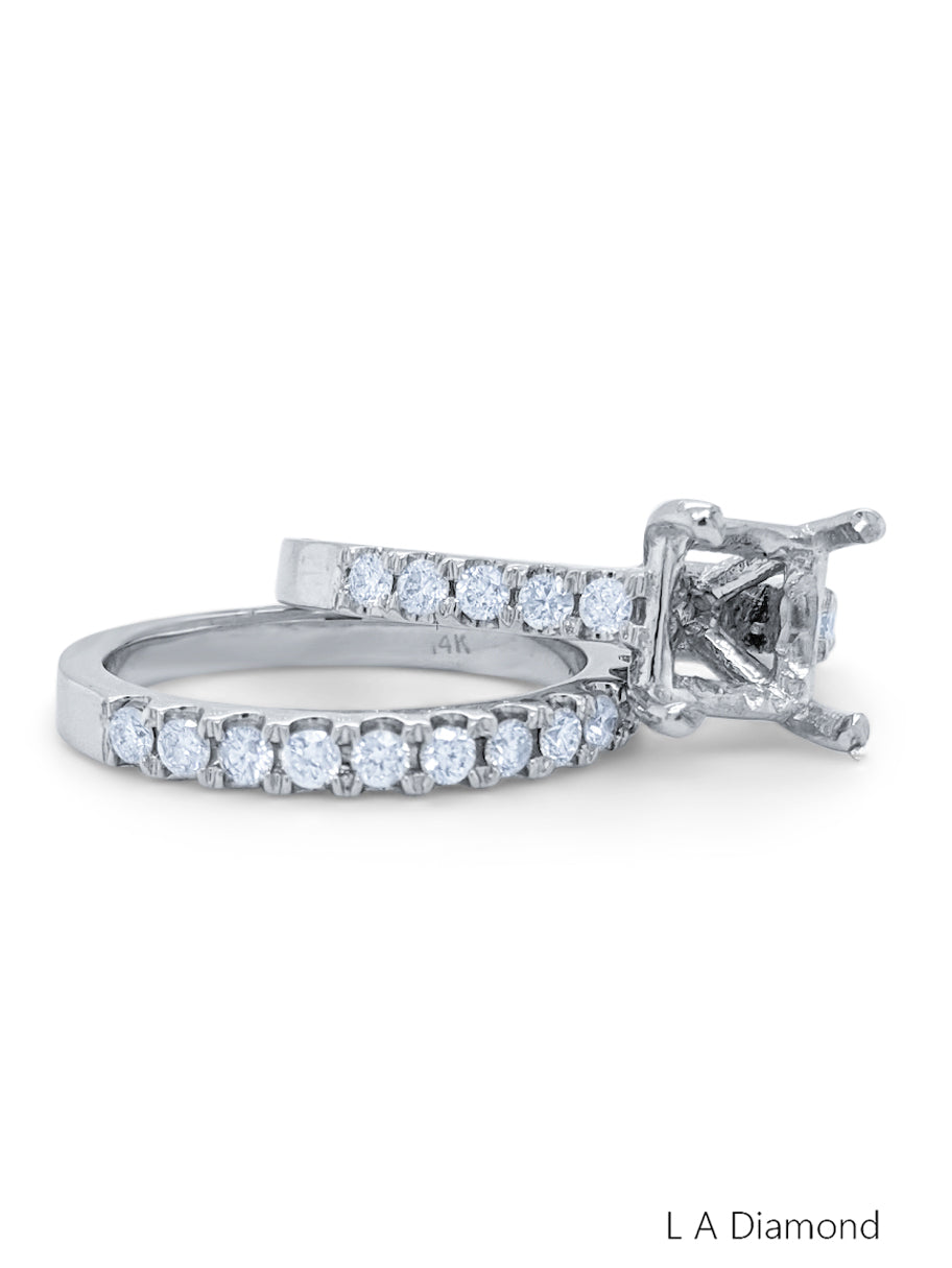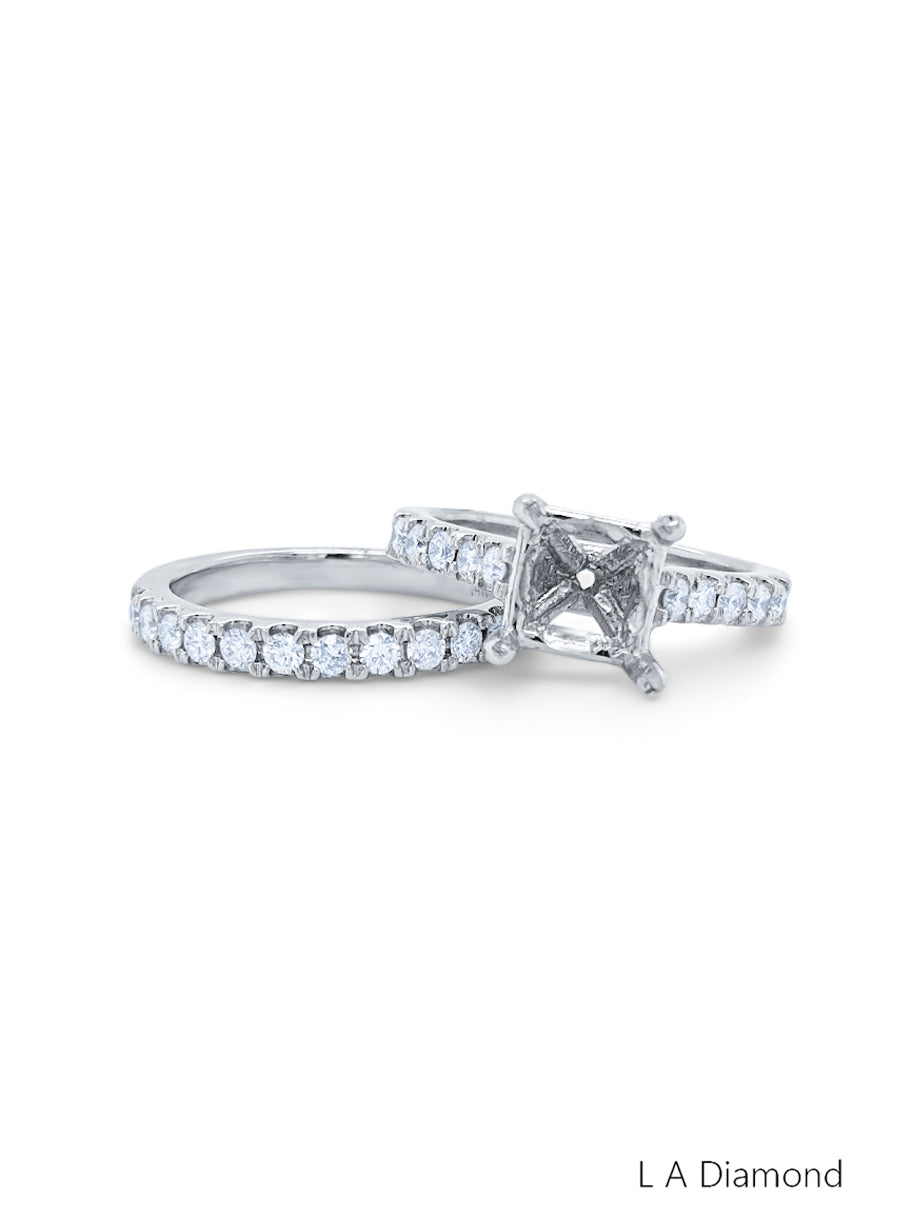 This 14K white gold bridal semi-mount ring set features a total diamond weight of 0.90 carats, comprising a princess-cut center stone flanked by round-cut accent diamonds. The band is crafted from 3.20 grams of fine gold, offering a refined yet substantial feel.