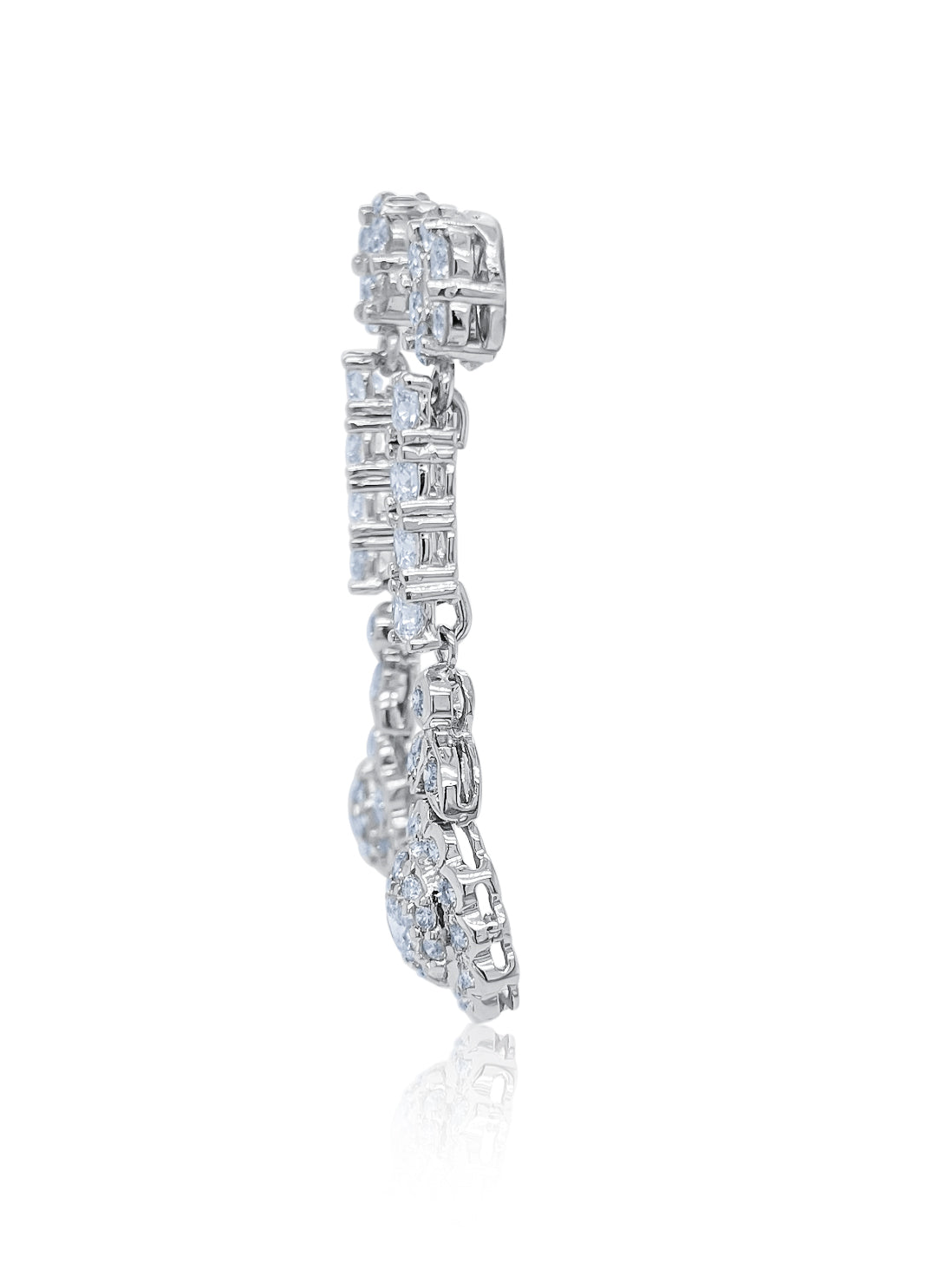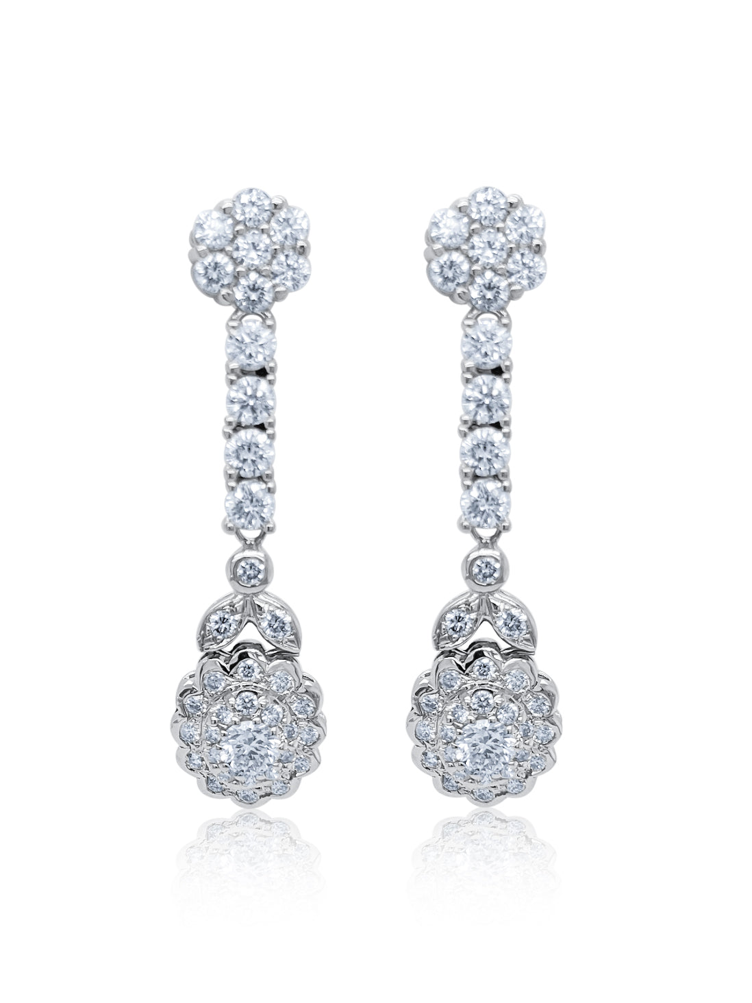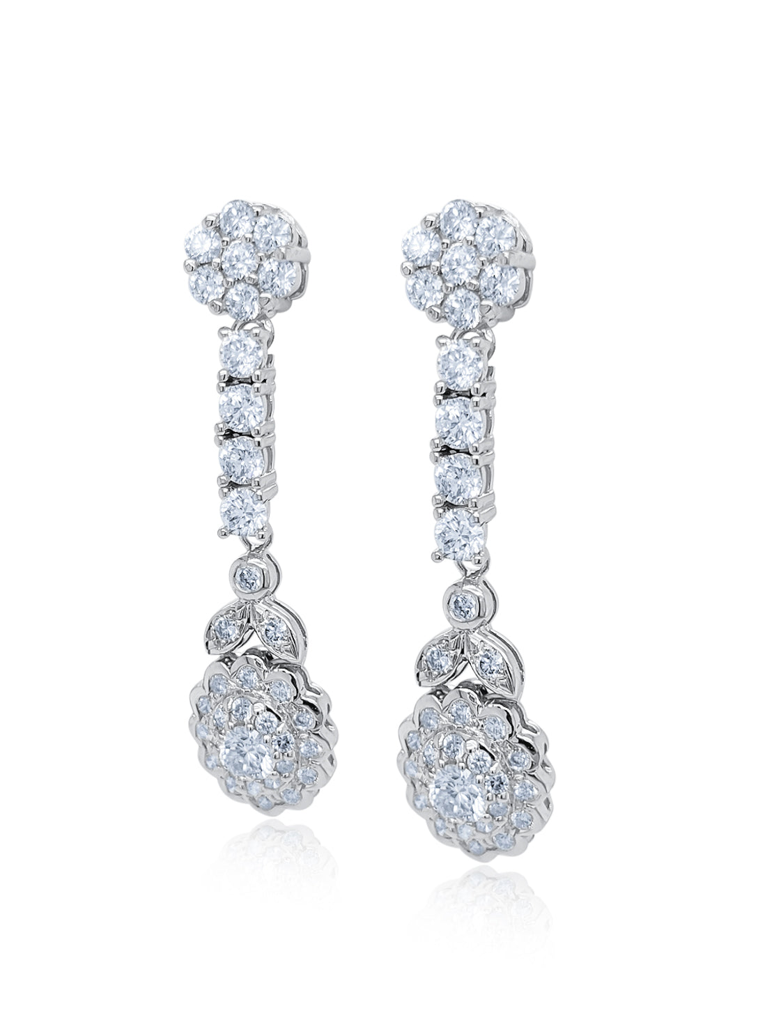 Elegant Cluster Drop/Dangle style featuring brilliant Round Diamond cuts.