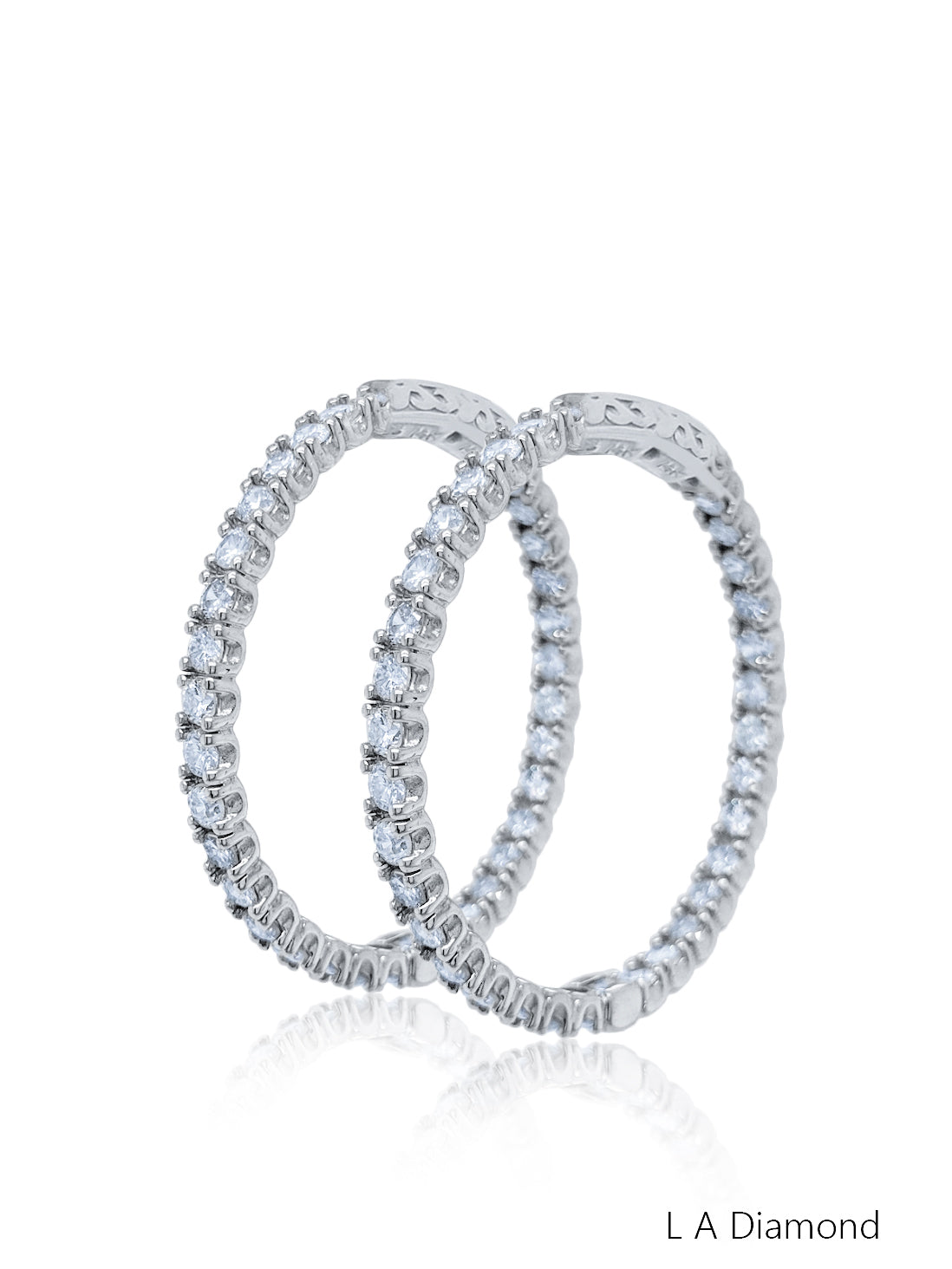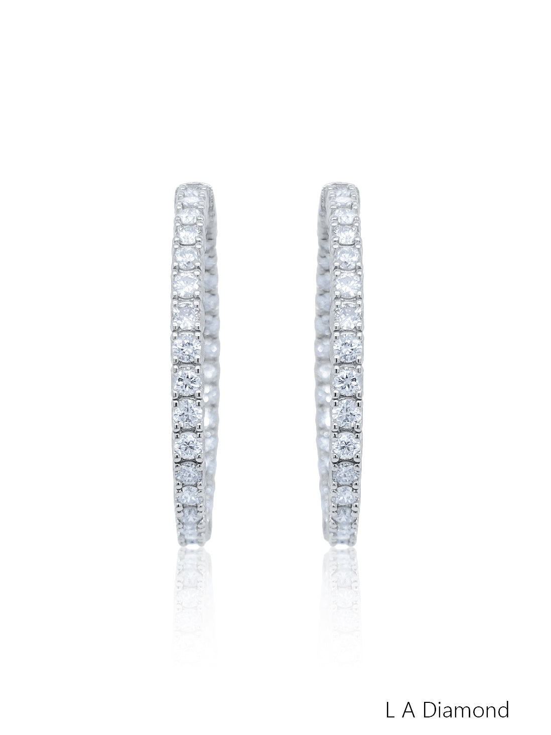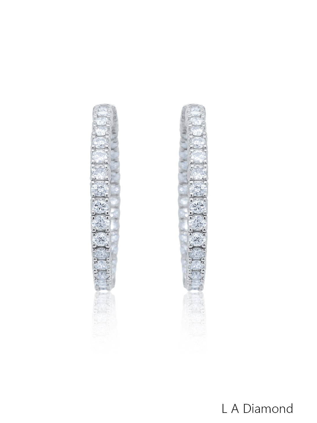 Elevate your look with the continuous sparkle of these exquisite diamond hoop earrings. Crafted in polished 14K White Gold, these hoops feature a brilliant total diamond weight of approximately 2.50 carats. The diamonds are meticulously set around the entire exterior and part of the interior curve (Inside-Out style), ensuring maximum visibility and fire from every angle. They are the perfect blend of modern sophistication and timeless glamour.