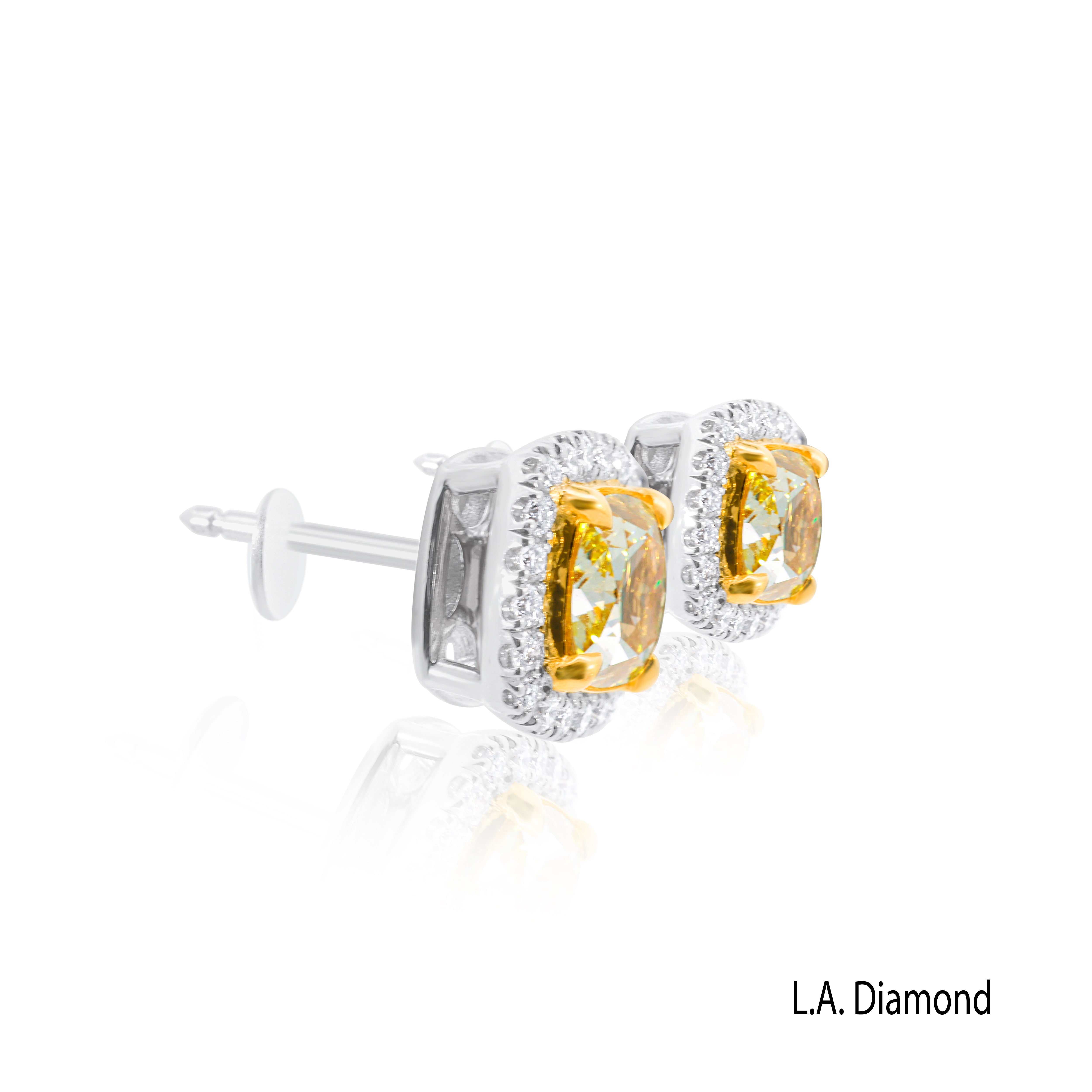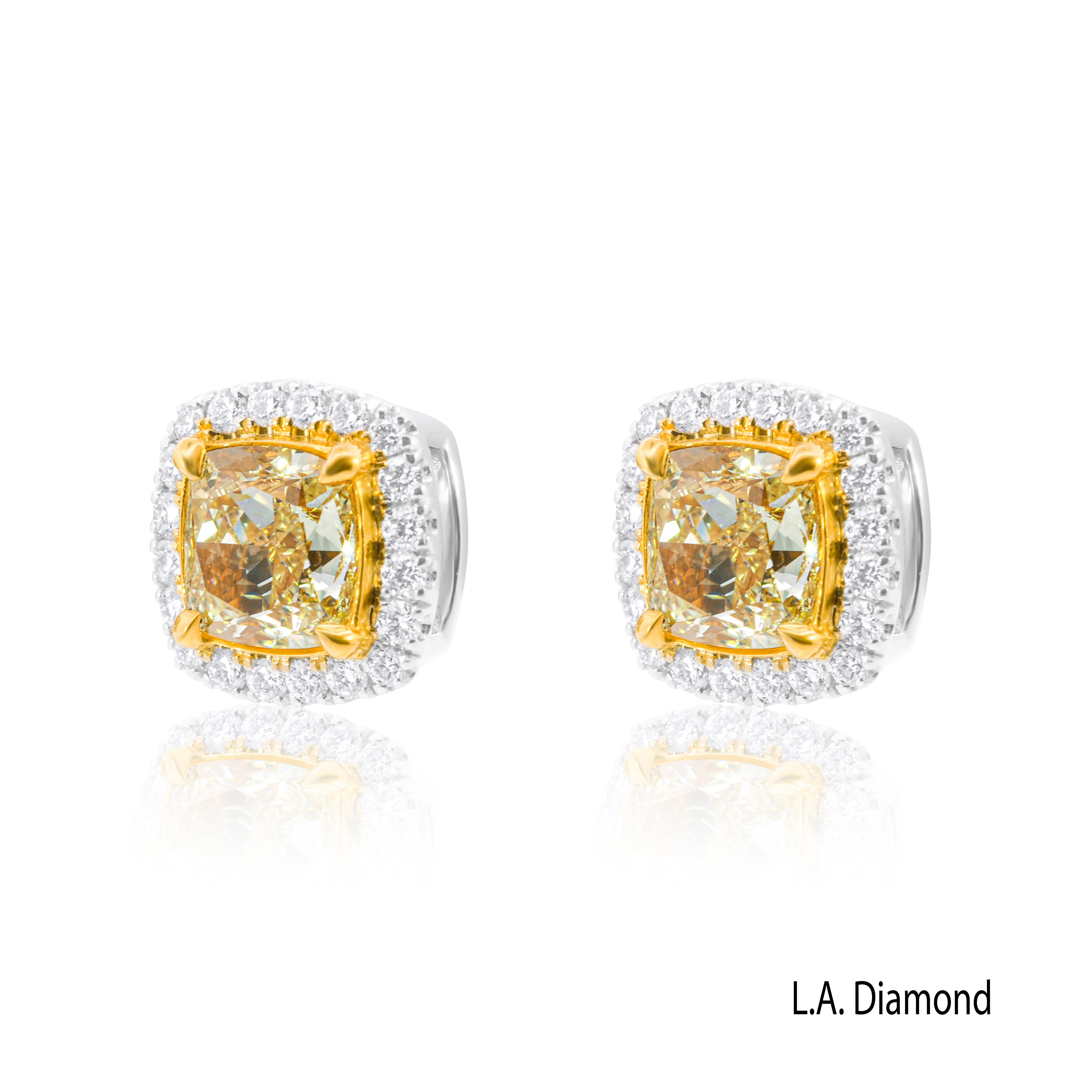 Elevate your glamour with the spectacular La Diamond Fancy Yellow and White Diamond Dangle Earrings. These high-jewelry pieces are meticulously crafted in premium 18K Two-Tone Gold, featuring warm yellow gold settings to enhance the central Fancy Yellow Cushion-cut diamonds and cool white gold settings for the surrounding white diamonds. The stunning floral-inspired dangle design is composed of brilliant Marquise-cut diamonds and pave accents, creating an exquisite framework around the vibrant yellow centers.