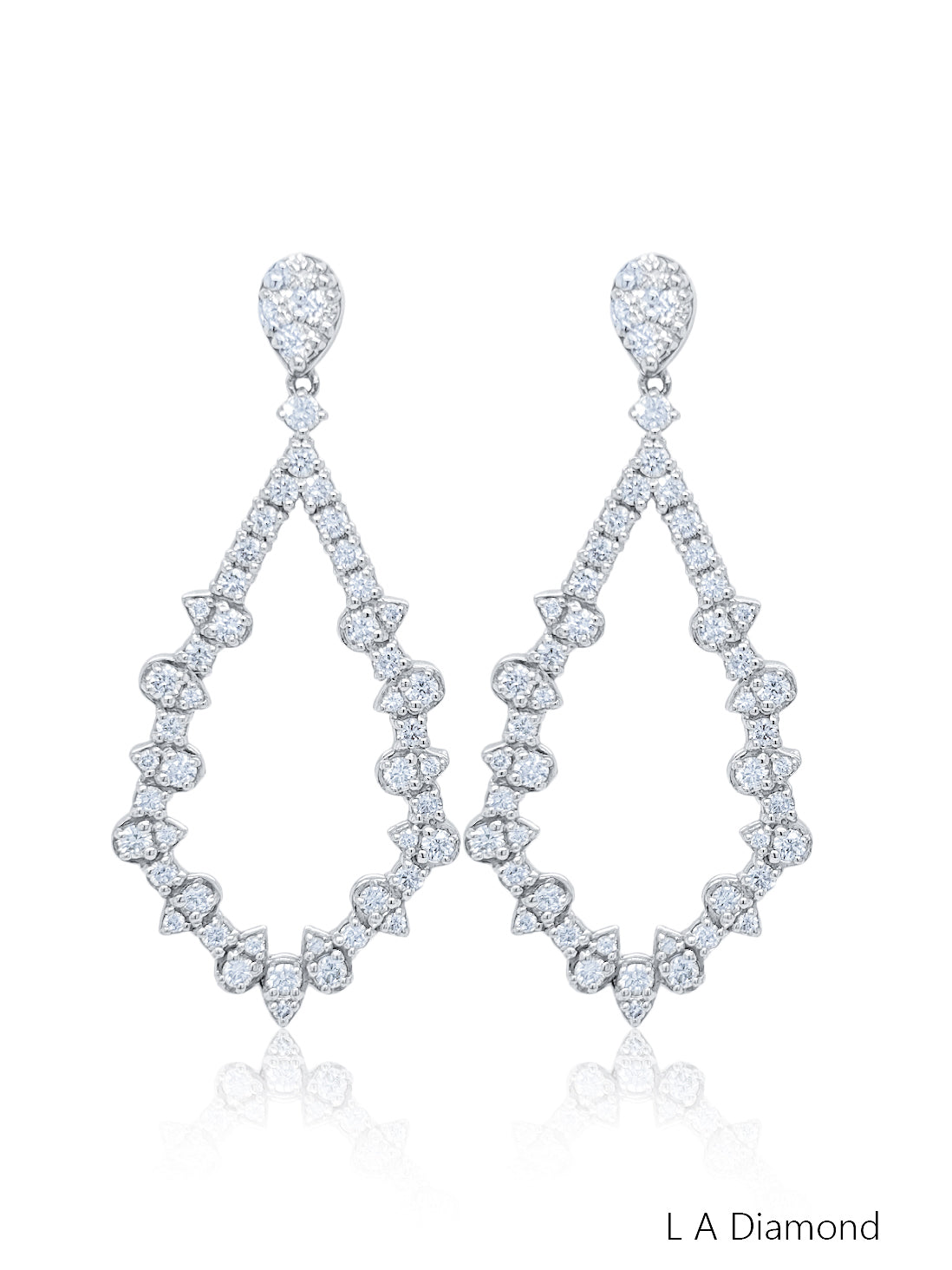 Step into the spotlight with the breathtaking La Diamond Ornate Floral Cascade Dangle Earrings. These high-fashion earrings are meticulously crafted in luminous 14K White Gold and feature an elaborate, dramatic design. The top section and perimeter are composed of elegant, clustered floral motifs, all completely encrusted with brilliant Round Brilliant-Cut diamonds. Cascading from the main cluster are multiple shimmering strands of diamonds, creating a waterfall effect that dramatically catches the light with every movement.