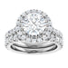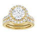 This elegant 14K gold bridal set features a round brilliant cut diamond center stone, enhanced by a halo of accent diamonds and paired with a perfectly matching band. The polished gold setting amplifies the sparkle, creating a timeless and sophisticated design.