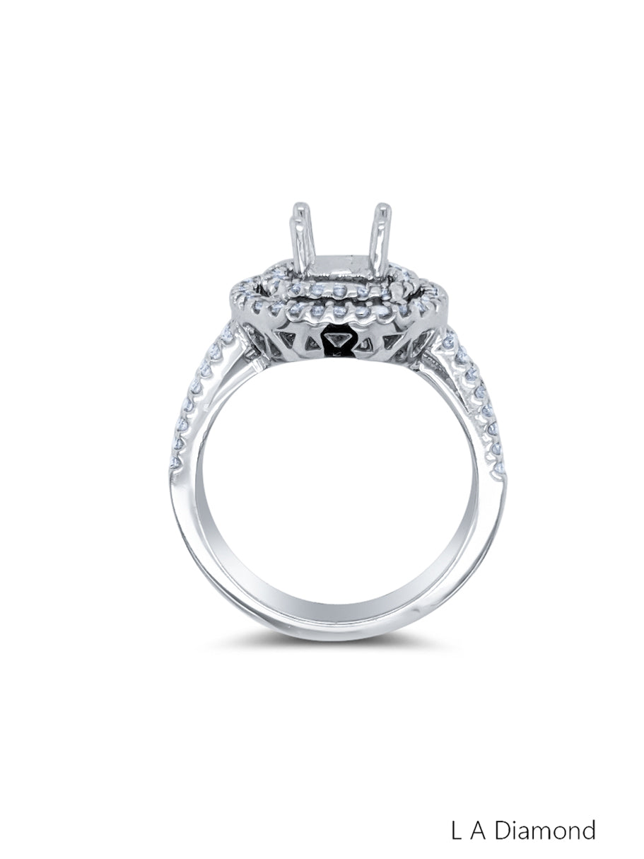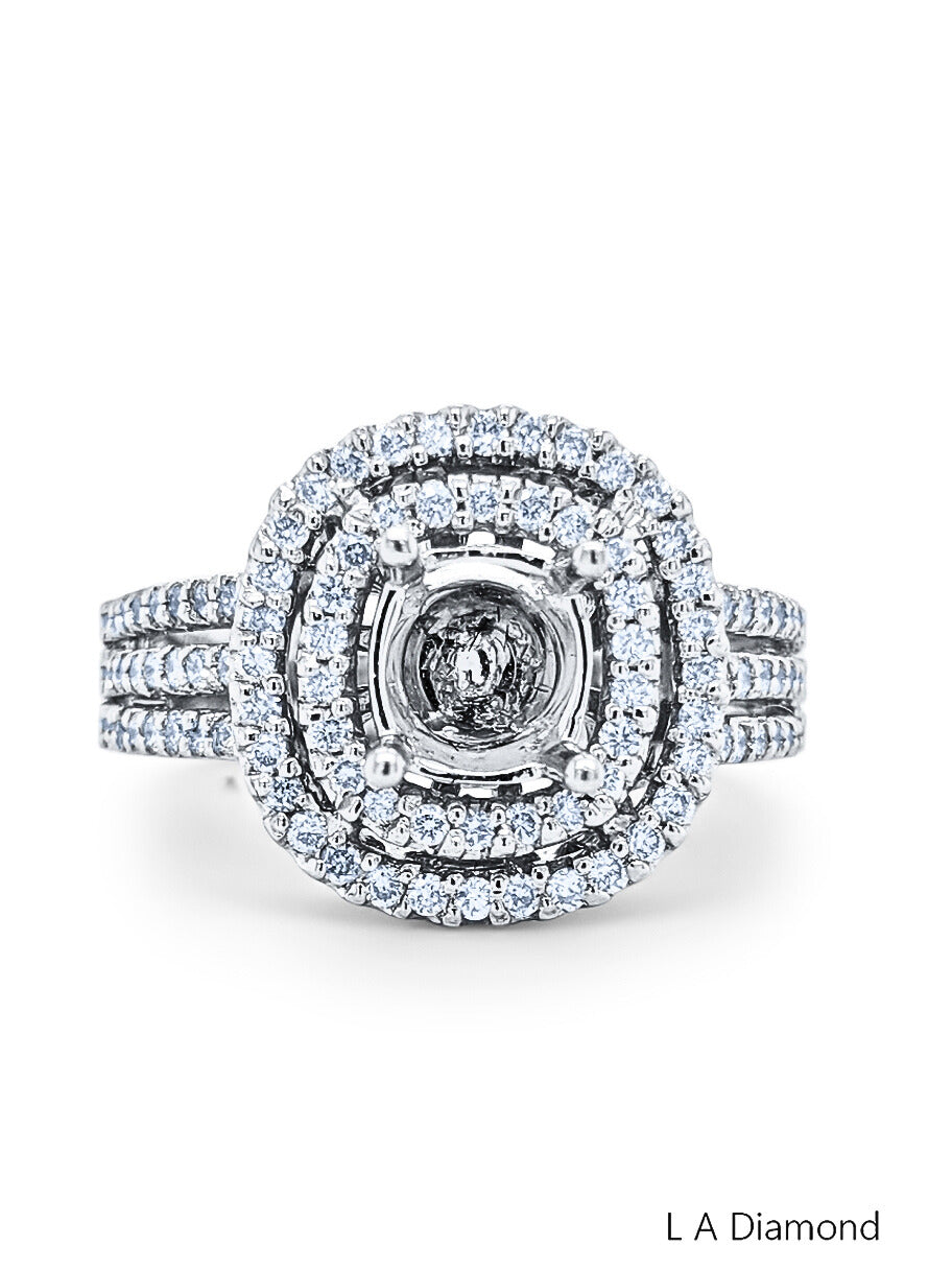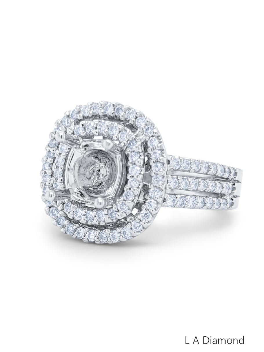 This 14K white gold semi-mount engagement ring features a total diamond weight of 1.78 carats, comprising a round-cut center stone surrounded by two halos of accent diamonds. The band is crafted from 6.60 grams of fine gold, offering a refined yet substantial feel.