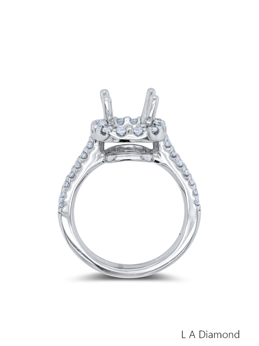 This 14K white gold semi-mount engagement ring features a total diamond weight of 0.86 carats, comprising a cushion-cut center stone surrounded by a halo of accent diamonds. The band is crafted from 5.86 grams of fine gold, offering a refined yet substantial feel.