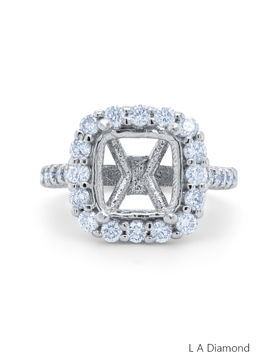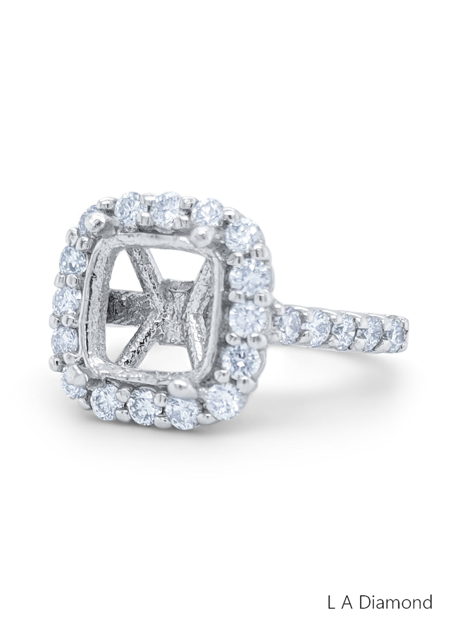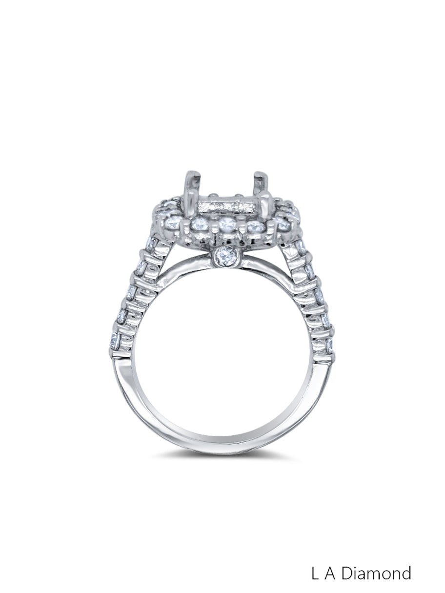 This 14K white gold semi-mount engagement ring features a total diamond weight of 1.00 carat, comprising a princess-cut center stone flanked by round-cut accent diamonds. The band is crafted from 5.00 grams of fine gold, offering a refined yet substantial feel.