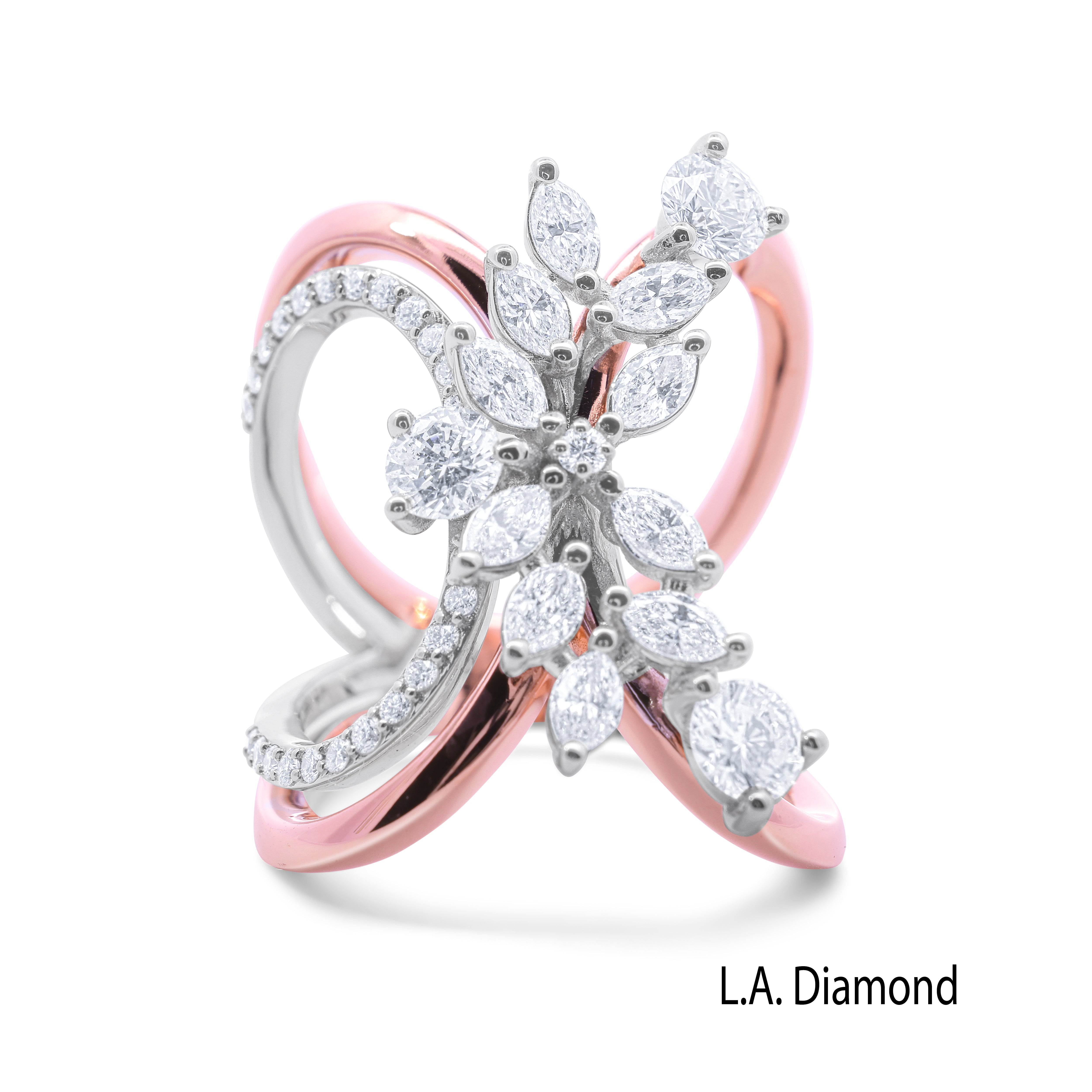 Make a striking, artistic statement with the La Diamond Dual-Tone Marquise Diamond Bypass Ring. This exquisite fashion piece seamlessly blends the romantic warmth of 14K Rose Gold with the crisp brilliance of 14K White Gold, creating a mesmerizing, sculptural effect. The focal point is a vibrant cluster of Marquise and Round Brilliant-cut diamonds, artfully arranged to resemble a luminous floral spray, perfectly contrasted against the sweeping, polished bypass bands.