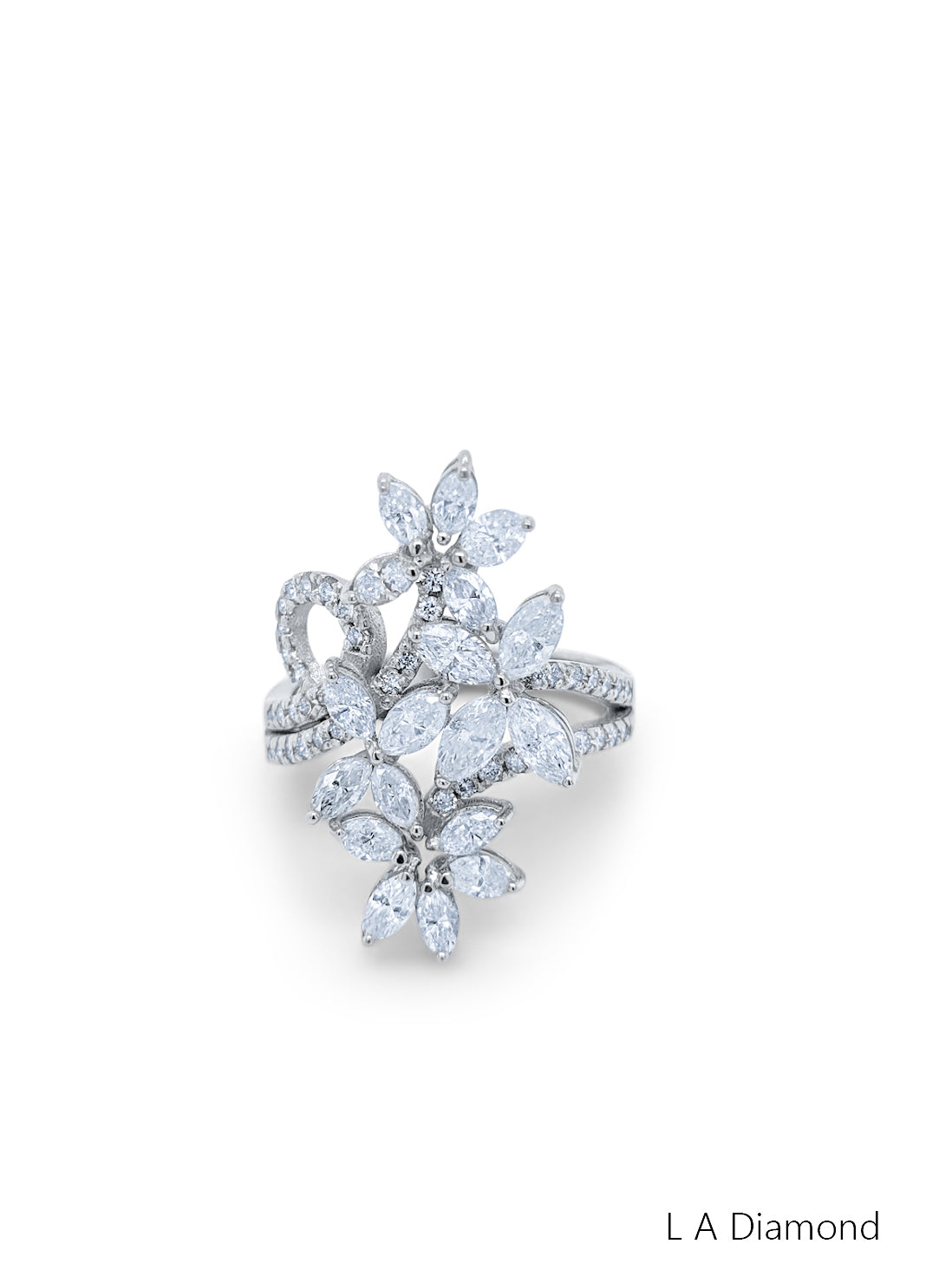 Step into a garden of brilliance with the La Diamond Marquise Diamond Floral Cluster Ring. This magnificent fashion ring is crafted in luminous 14K White Gold and features a stunning, elaborate arrangement of diamonds. Multiple Marquise Brilliant-cut diamonds are meticulously clustered to form three distinct, sparkling flowers, artfully connected by flowing bands of pavé-set Round Diamonds. The delicate, sculptural design ensures maximum light return and visual drama.