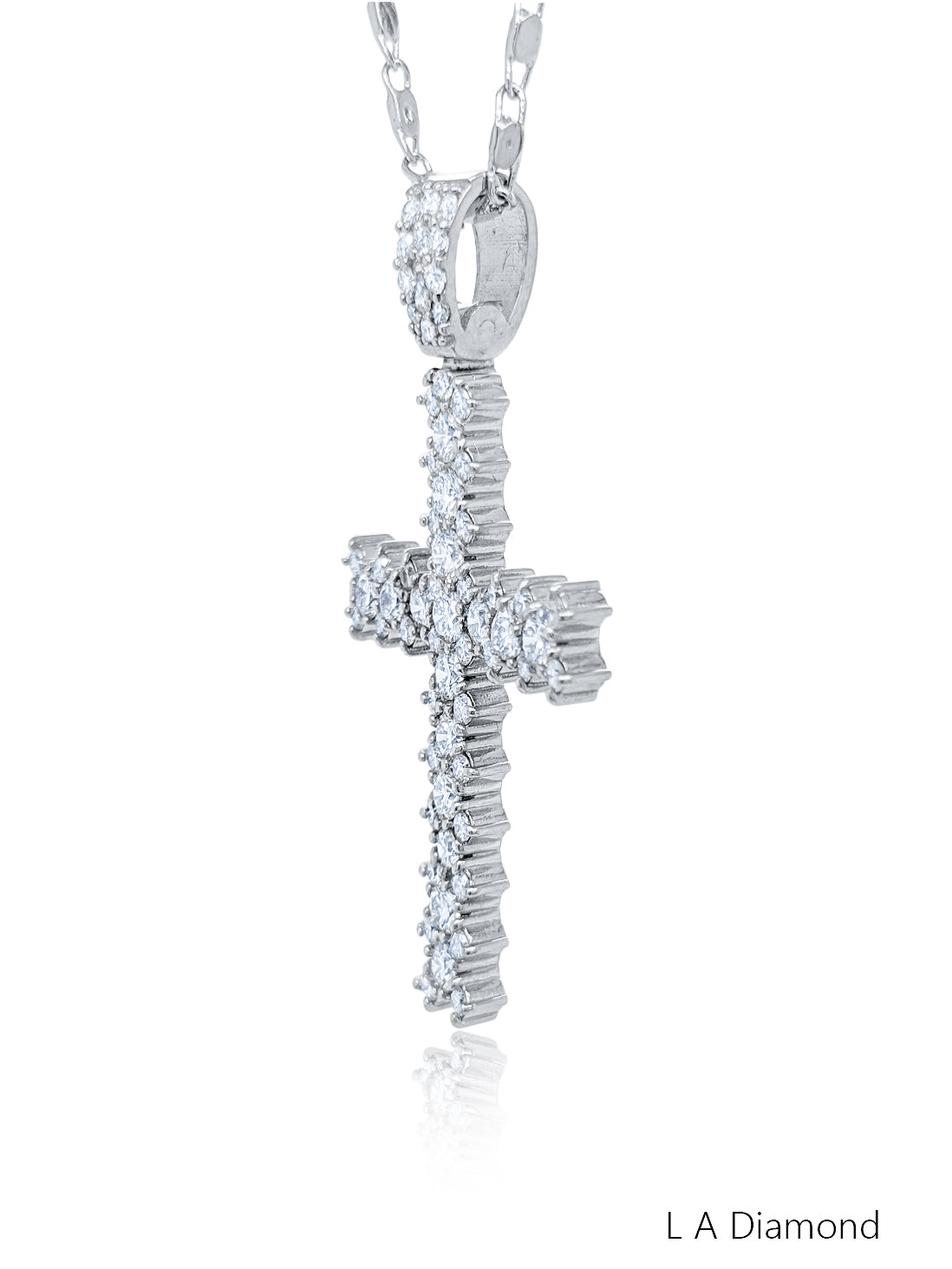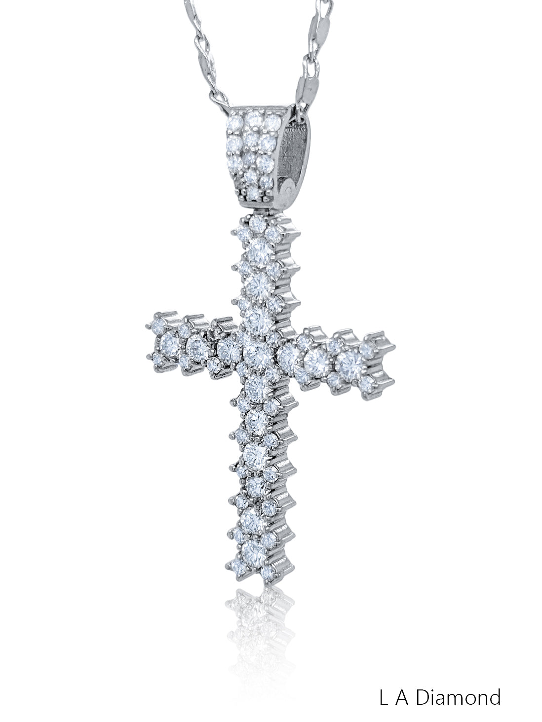 Elevate your faith with the exquisite La Diamond Diamond Cross Pendant Necklace. This beautiful piece is crafted in radiant 14K White Gold, featuring a classic cross silhouette set entirely with sparkling Round Brilliant-cut diamonds. The cross itself boasts a significant total diamond weight of 2.00 carats, offering a striking, continuous cascade of brilliance.