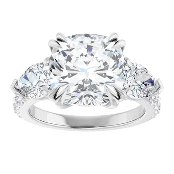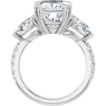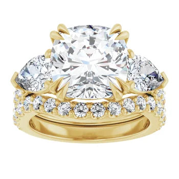 Cushion Cut and Pear Side Stone Diamond Three Stone Wedding Set with Matching Contour Pave Band - Set on 14k Gold